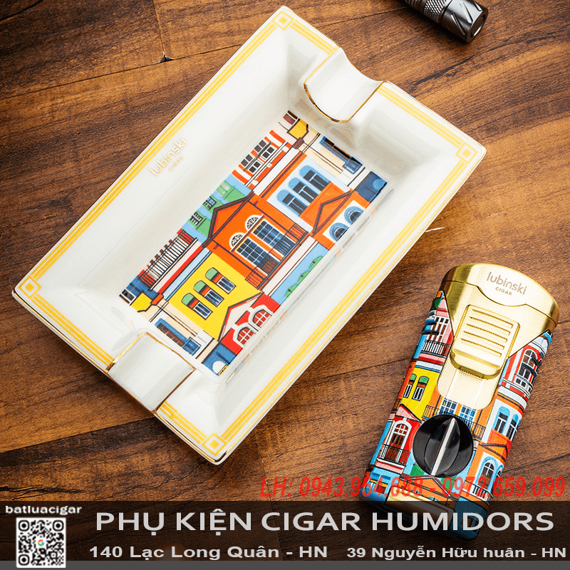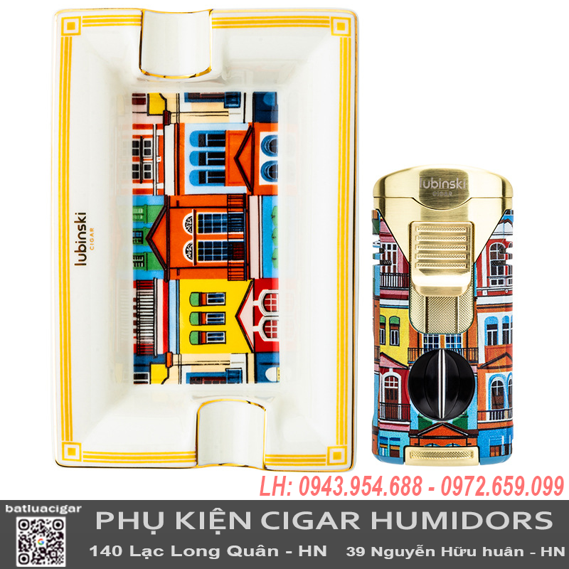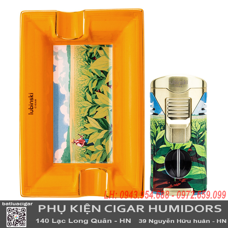 Bộ phụ kiện cigar Lubinski YJA-80034 – Bật lửa khò 2 tia và gạt tàn cao cấp, hợp kim kẽm + sứ sang trọng